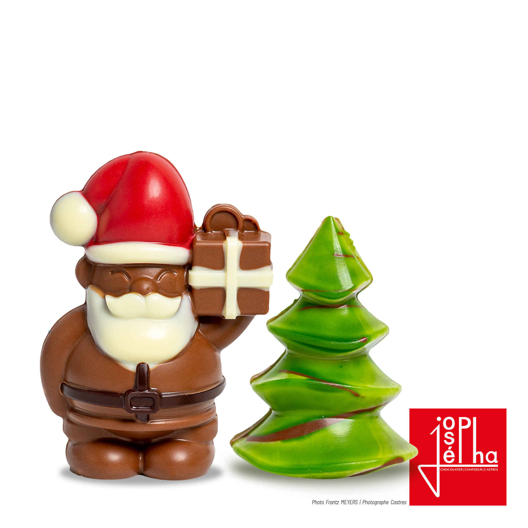 Le Père Noël chocolats noir 68% garnît avec de petites fritures chocolat noir, chocolat lait et chocolat blanc.